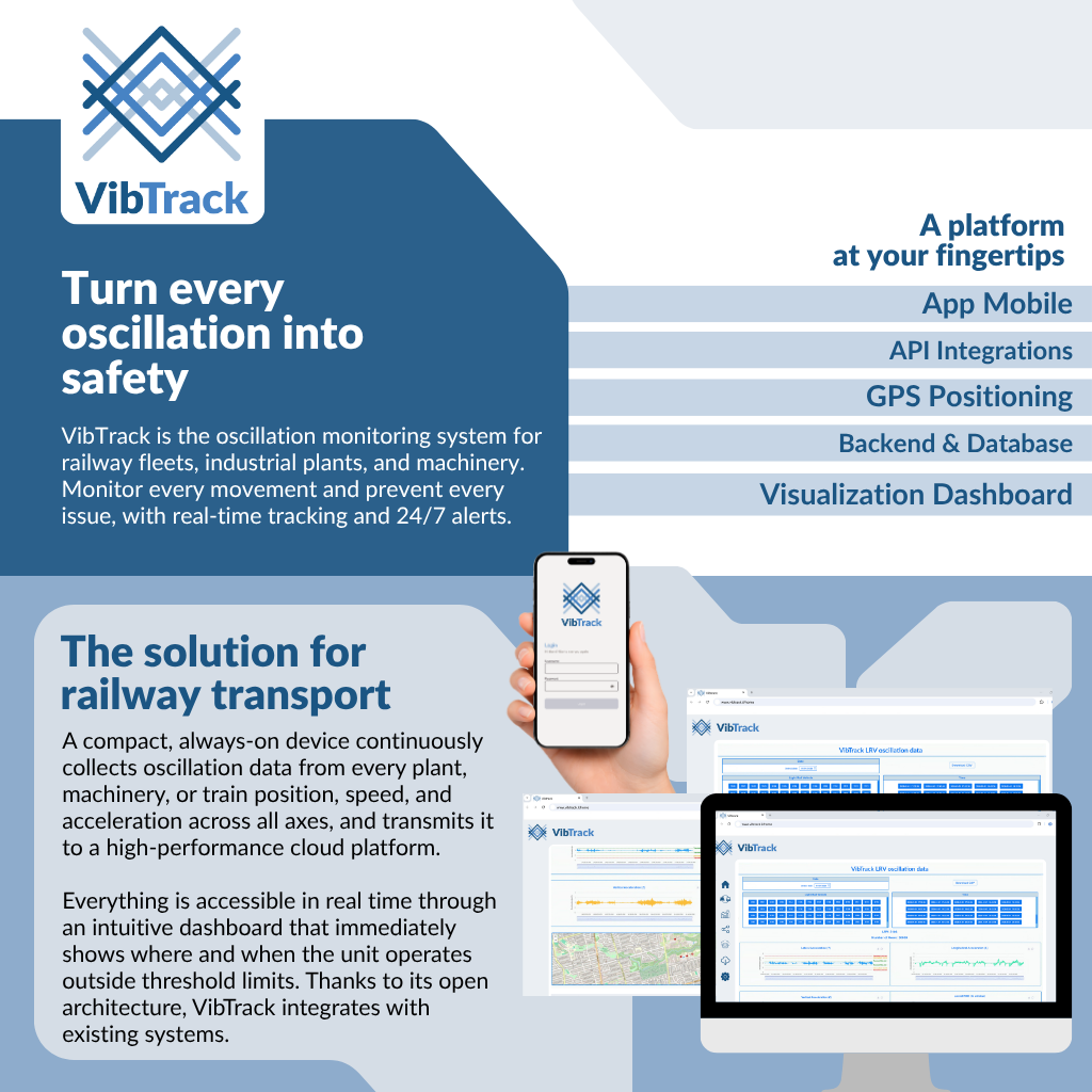 VibTrack is the solution for monitoring oscillations in railway networks and industrial plants and machinery across all sectors. Smartphone-based, it eliminates the need for dedicated hardware and integrates with existing operational infrastructure without migrations or external dependencies.